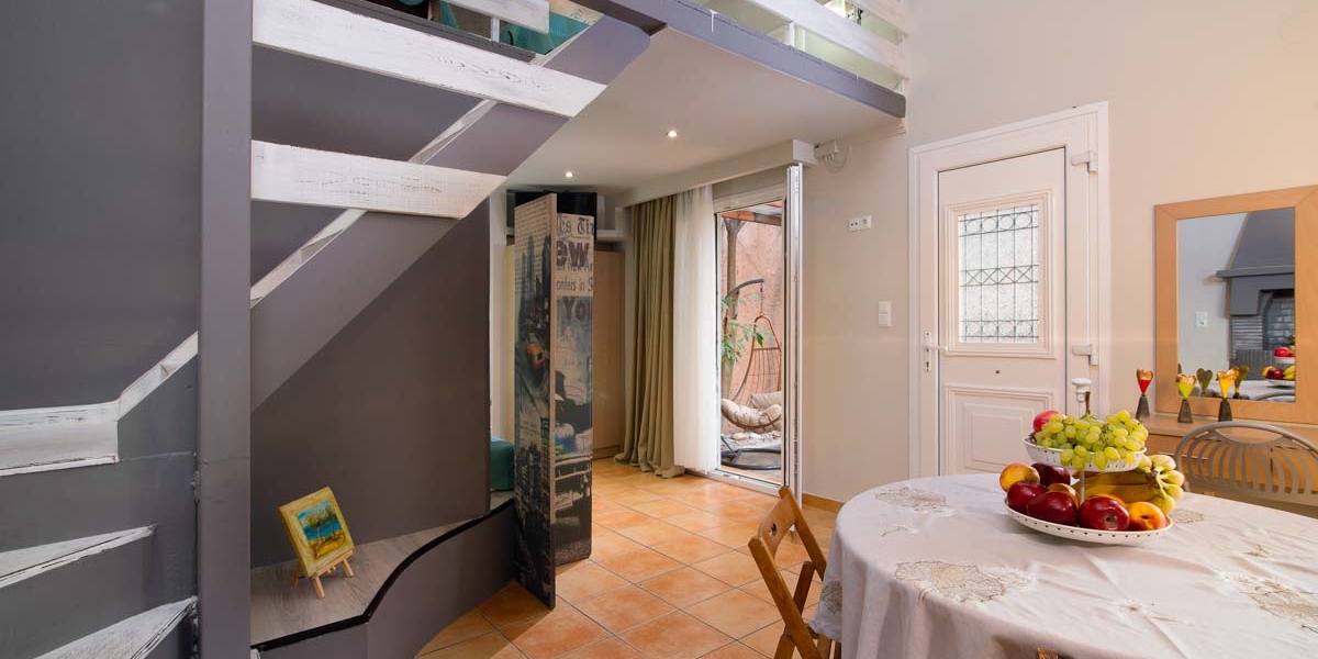 The maisonette is elegantly designed & decorated and is ideal for families or a group of friends since it can accommodate up to four people. It features a king-size double bed on the ground floor and two single beds on the top floor which is accessible via an internal staircase.